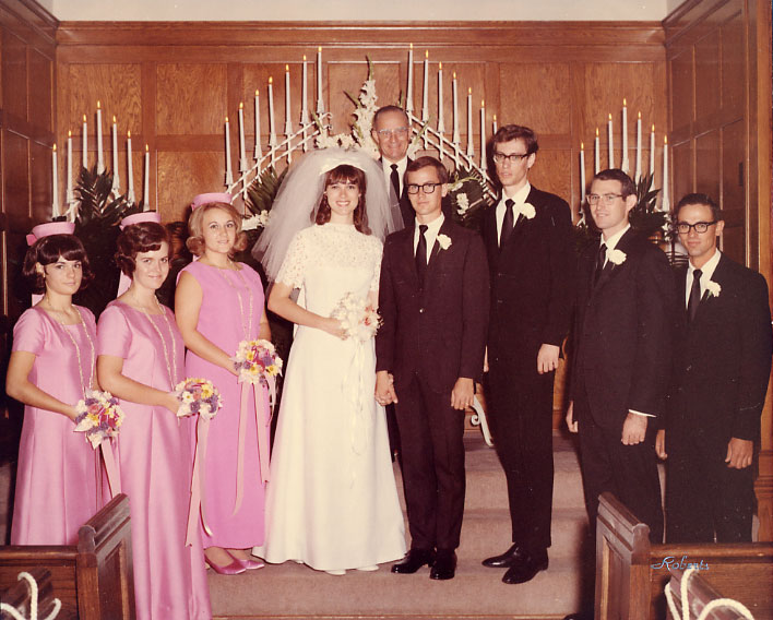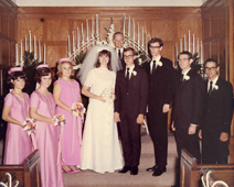 Jay and Pat's wedding in the College Chapel. From left to right: Cathy M. D., Mary Alice D. (Jay's sister), Charlene F. S. (maid of honor), Pat and Jay in front of the minister, Rev. Dr. LeMoyne Lewis, David B. (best man), Mike M. (Pat's brother), and Vernon C. (Jay's cousin).