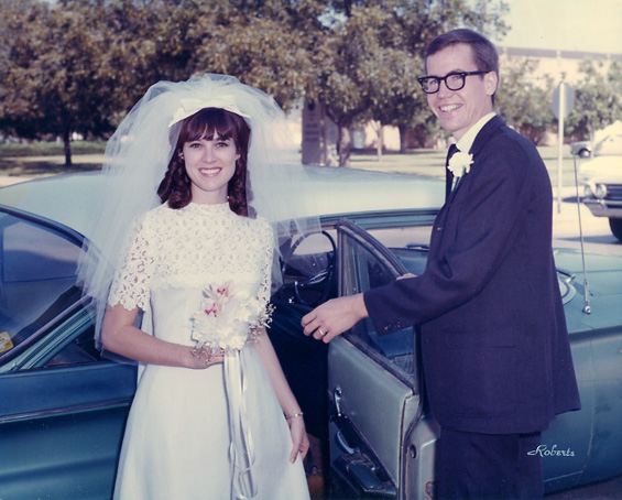 Wedding picture of Pat and Jay outside of the chapel of College Church awhile back. Jay's '59 Chevy was definitely "old" in '69 but not an "antique" at the time. Pat and Jay no longer have this car nor do they look like this anymore.