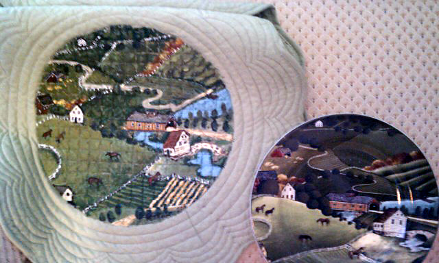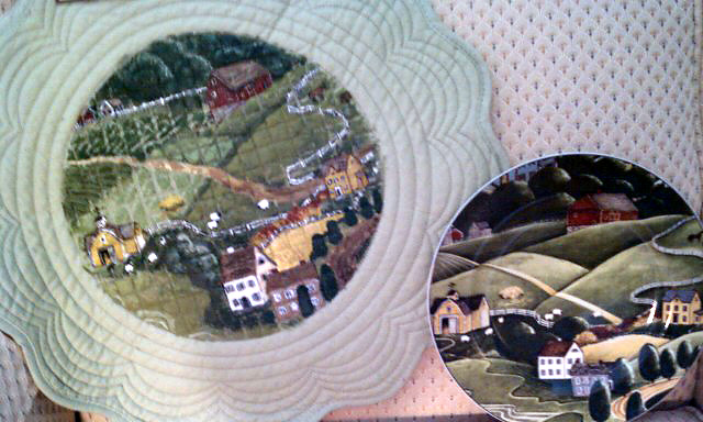 Property of Mrs. W. Haslett, PA. A Christmas gift from Pat to Sharon, 2011. Plates, and handpainted placemats that match the plates. The actual color of the placemats is somewhere between the two representations here; perhaps a little more like the center photo.