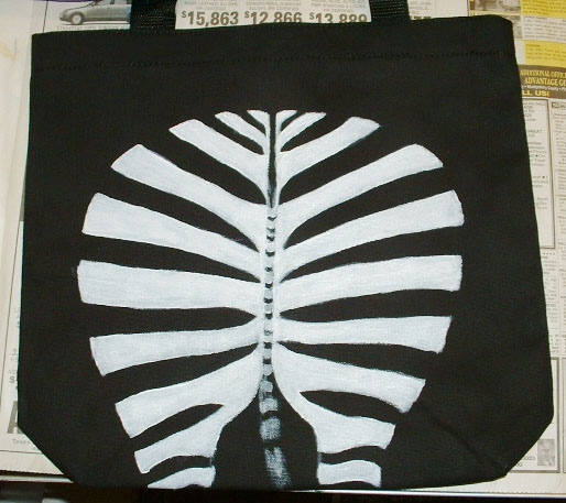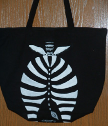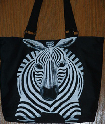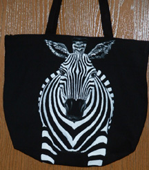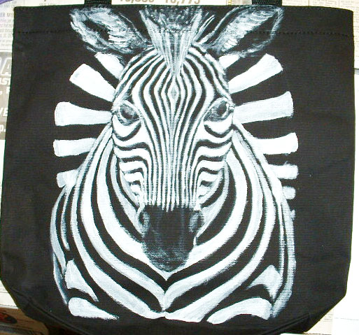 Zebra Bag #3, (on medium size soft cotton bag 17.5 x 16.5 x 5, with top zipper) sold at Craft Fair 10.2005 to Joyce Doup (legs meet at bottom of bag)