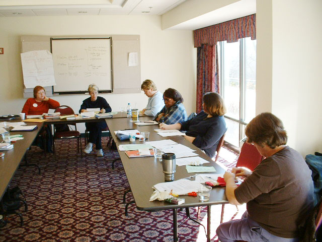 Above center foreground (facing us): Brenda Etheridge (kneeling), from our Office of Disciples Women, takes a moment before the meeting begins to check notes with Marie Fleming. Marie Fleming is now doing mission work in Central America.