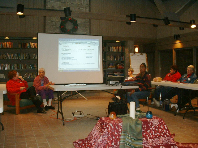An interregional meeting, such as this one, known as NIRF, is held every 3 to 4 years. The date for this event was October 22-24, 2004 and was held at Camp Christian in Ohio. Among other things, we learned more about the Office of Disciples Women and how it functions along with the Office of Overseas Ministries. We received a moving report from Adonna Bowman of her Woman to Woman Program trip to Columbia to visit with the oppressed women of that mission. The regions in our group include the Capitol Area (DC), eastern Canada, Michigan, New York, Ohio, Pennsylvania, and West Virginia.