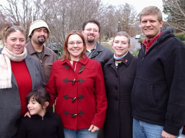 Tim, preventing Emily from floating to the ceiling, and Pat and Jay behind Jayson and Brenda. Behind us is Tim and Emily's Christmas tree.