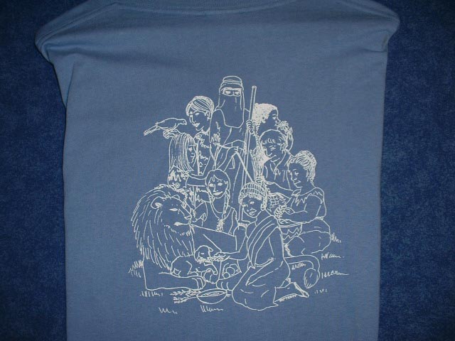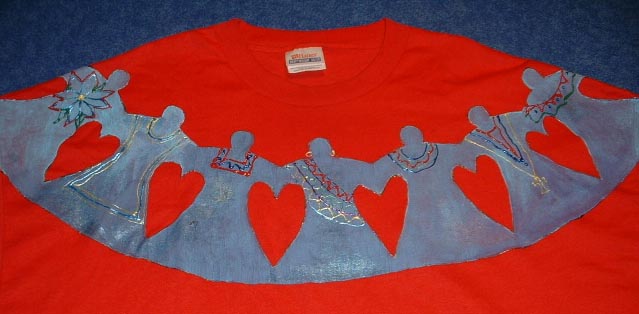 The following design was created by Pat for the Christian Women's Fellowship Retreat (in PA) of 2003. Pat visualized the design during a planning committee meeting, and made a drawing of it for the others, and then went home to made a template to send back for the silkscreening. Pat painted this T-shirt. The design was used for advertisement in the regional newspaper, The Keystone Christian, and on posters. It was also used on registration forms, on retreat programs, on the T-Shirt (shown), and silk-screened onto bags that were sold at the retreat: (Note that the interlocking arms create hearts between the women, symbolic of how our working together with women of other nationalities and walks of life creates love between us.)